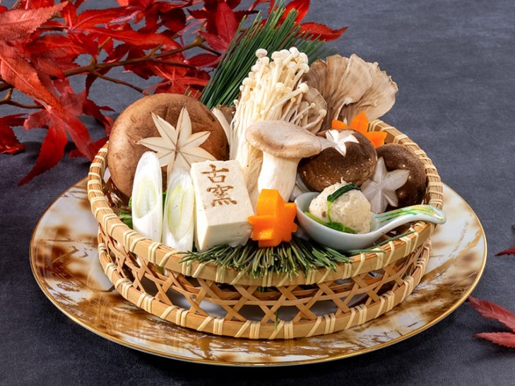 秋の吹き寄せをイメージした茸のみぞれ鍋。大根おろし(みぞれ)でさっぱりとした味わいに仕上がっています。5種類の茸(なめこ、ふくろたけ、ヒラタケ、なら茸、ぶなしめじ)をふんだんに使用。茸は、鶏のつみれとも相性抜群。秋風に吹き寄せられたかのような風情ある見た目もお楽しみいただけます。