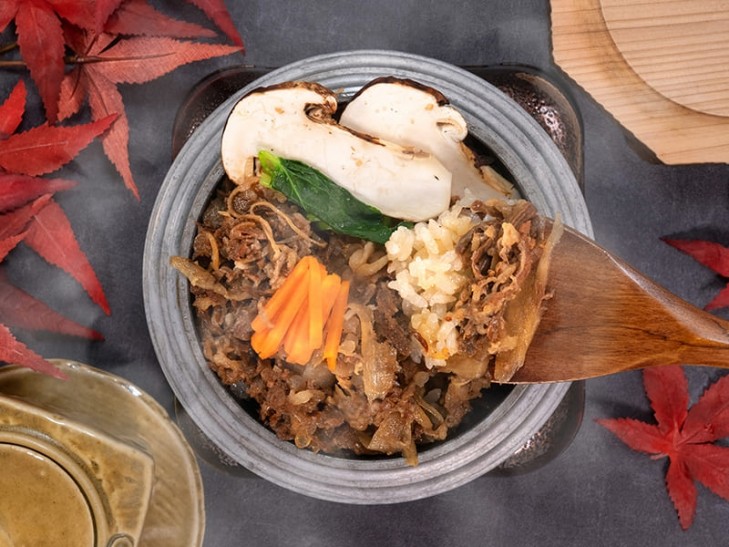 三度の味をお楽しみいただける古窯名物牛窯めし。秋会席ではこの時期ならではの松茸を入れてご提供いたします。まずは、窯を開けた瞬間に立ち上る香りを堪能しながらふっくら炊き立て山形県産「つや姫」米ともち米でシンプルに。次に、松茸と一緒に山形牛の牛脂を使用して炊き上げた牛しぐれ煮をのせて。松茸と牛しぐれ煮の相性は抜群です。最後には、特製の出し汁を入れ、米本来の旨味を堪能できる窯めしを楽しめます。また、沢庵漬けを作った沢庵和尚縁の地のかみのやまならではの「沢庵三種」は、牛窯めしと合わせていただくと食感のアクセントになります。