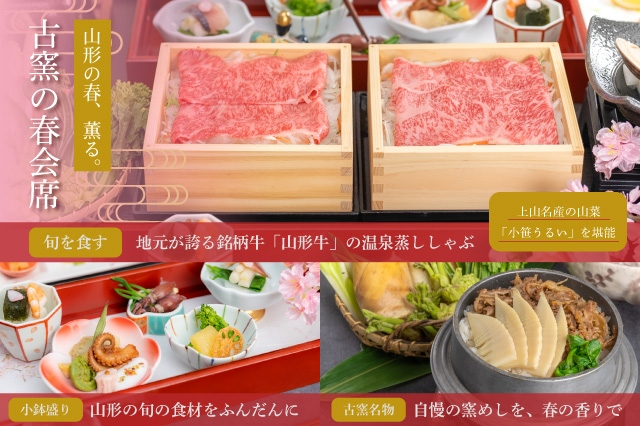 上山名産の「小笹うるい」など春の訪れを感じさせてくれる山菜を、前菜のみならず温泉蒸ししゃぶや古窯名物牛窯めしにもふんだんに盛り込みました!