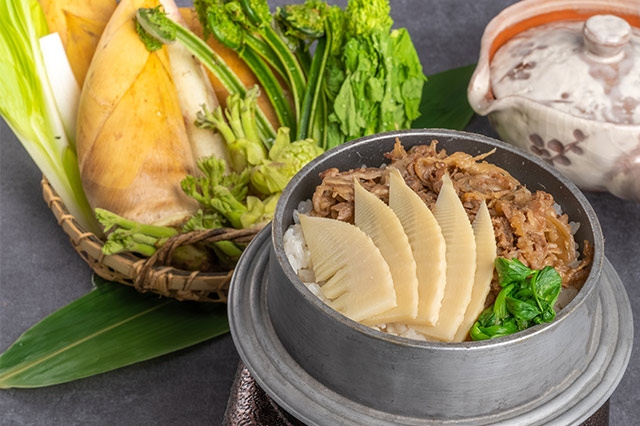 春会席では、たけのこ入りの牛窯めしを提供いたします。まずは、炊き立ての山形県産「つや姫」米ともち米でシンプルに。次に山形牛の牛脂を使用して炊き上げた牛しぐれ煮をのせて。最後には特製の出し汁を入れ、三度の味をお楽しみいただける牛窯めしとなっております。