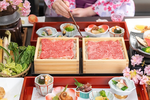 地元が誇る銘柄牛「山形牛」は、肉のきめが細かく適度な霜降りで、舌にのせたときの柔らかさとまろやかさが特徴です。山形の豊かな自然と厳しい気候条件が生み出す山形牛は、まさに山形風土の味そのもの。そんな山形牛を温泉蒸ししゃぶでご用意。特製ゴマだれとポン酢をお好みでお選びいただけます。春会席では、山形県産の山菜と一緒にお召し上がりください。